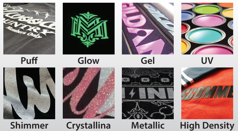 Make your design POP with different specialty inks.